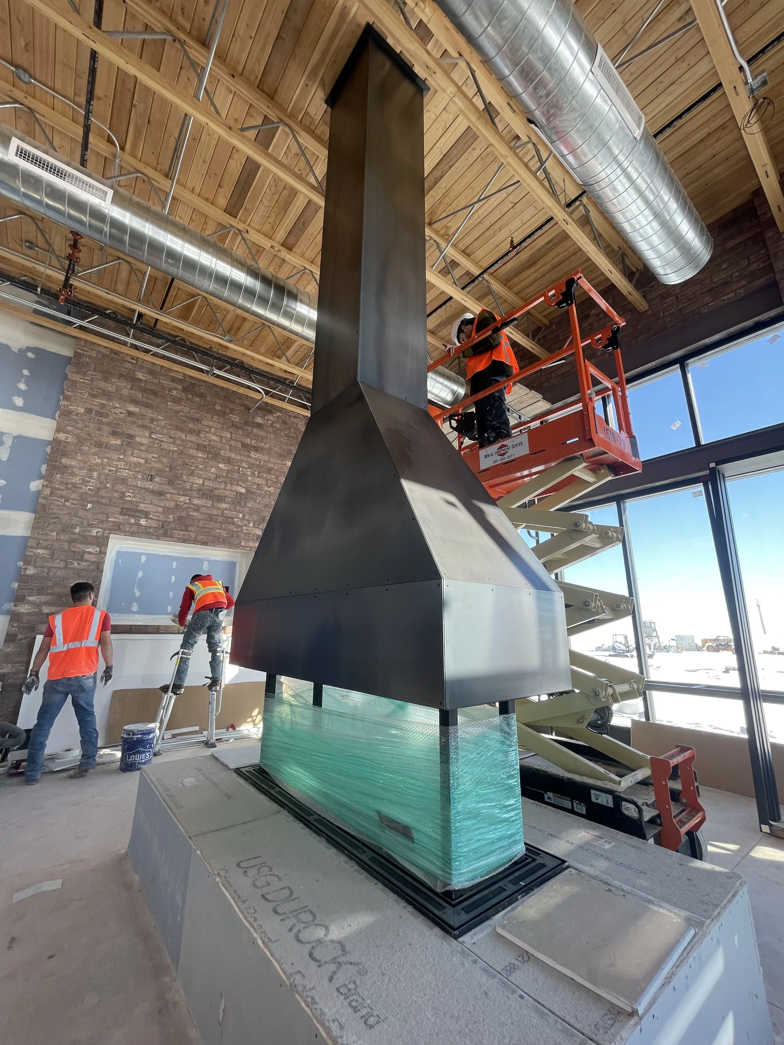 This stand alone pizza oven at Taxi is designed using an old existing brick chimney structure as the base. The actual oven/fire pit was hand built with all custom steel work creating highly efficient "back yard" pizza oven that produces some incredible food. Photo credit "Zeppelin Development"